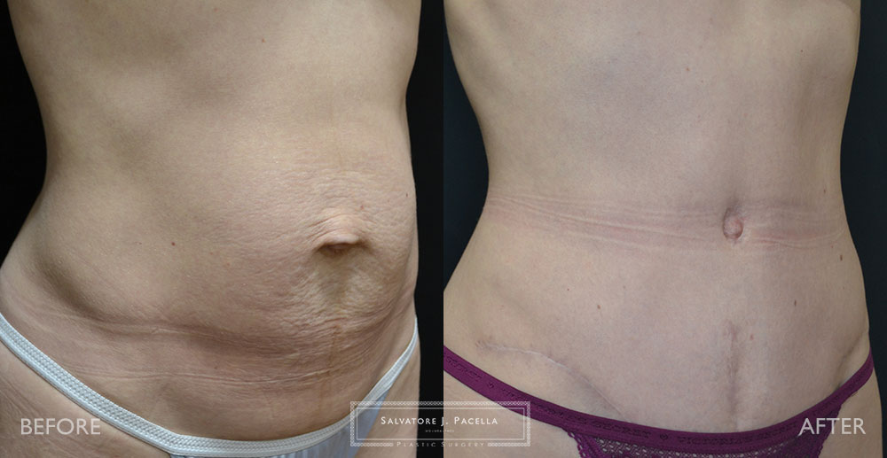This 33-year-old, female was unhappy with the appearance of her abdomen after several pregnancies. The separation of the central abdominal muscles (diastasis recti) as well as a hernia at the belly button were very unsightly for her and inhibited exercise. Tightening of the abdominal wall “six-pack” muscles was performed to treat the diastasis and the hernia. The excess skin was removed by performing an abdominoplasty. Her result at 1 year shows an excellent result.