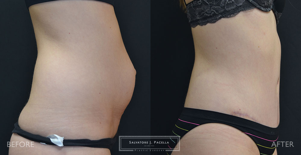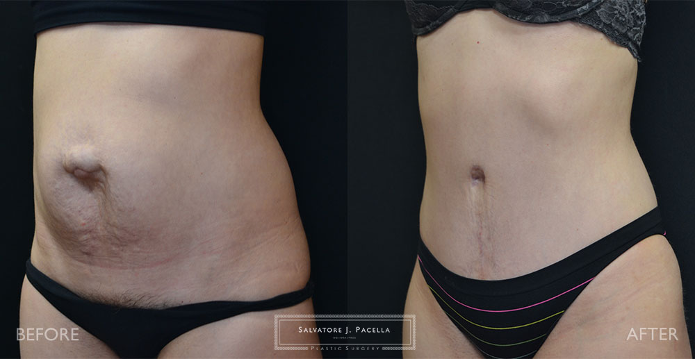 This 37-year-old, female was unhappy with the appearance of her abdomen after several pregnancies. She had a separation of the central abdominal muscles (diastasis recti) as well as a hernia at the belly button. Tightening of the abdominal wall “six-pack” muscles was performed to treat the diastasis and the hernia. The excess skin was removed by performing an abdominoplasty. Her result at 1 year shows a very tight and athletic tummy.