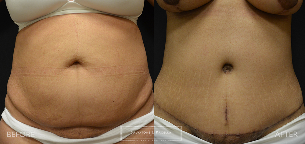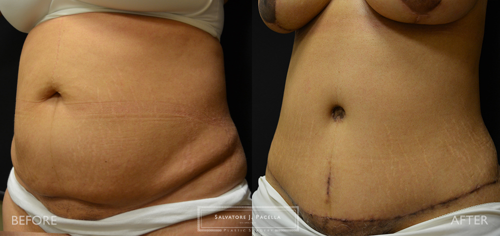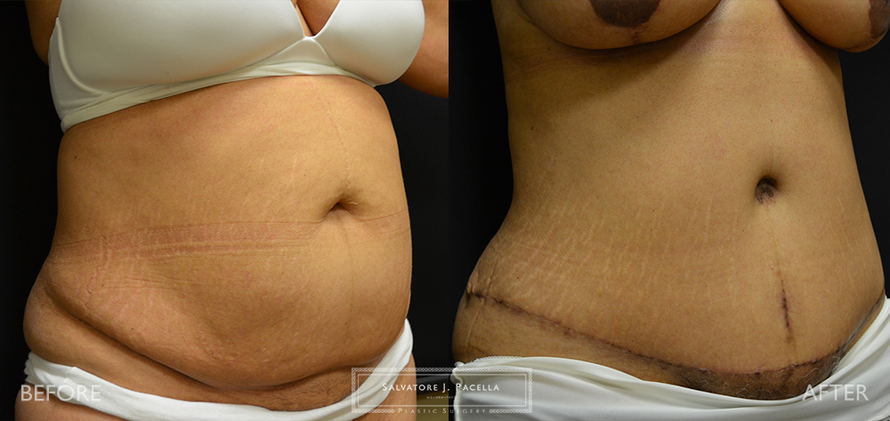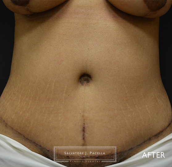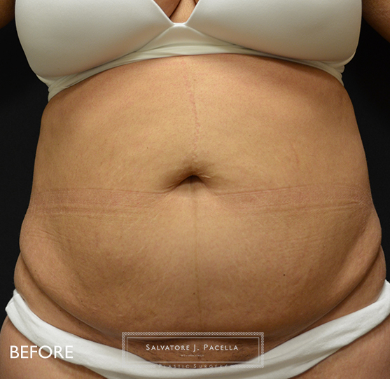 This 58 year-old female was unhappy with the appearance of her abdomen. An abdominoplasty, which removes excess skin and tightens the abdominal muscles, was performed. After surgery, she reported her waistline improved and her clothes fit much better. Postoperative result at 1 year shows a beautiful and shapely contour to her tummy.