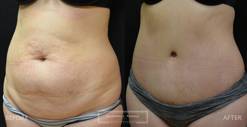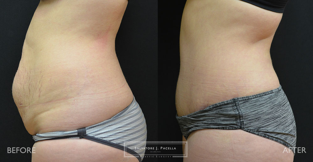 This 34 year-old female was unhappy with the appearance of her abdomen after multiple pregnancies. Abdominal core exercises and a strict exercise program could not tighten the skin around her belly button. An abdominoplasty, which removes excess skin and tightens the abdominal muscles, was performed. In addition, liposuction was performed around the lower back area to create a 360 degree improvement. Postoperative result at 1 year shows excellent contour to her abdomen with minimal scarring.