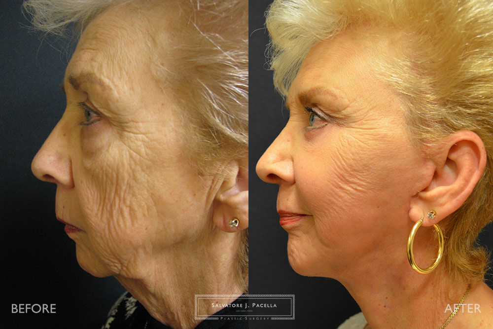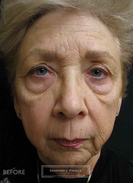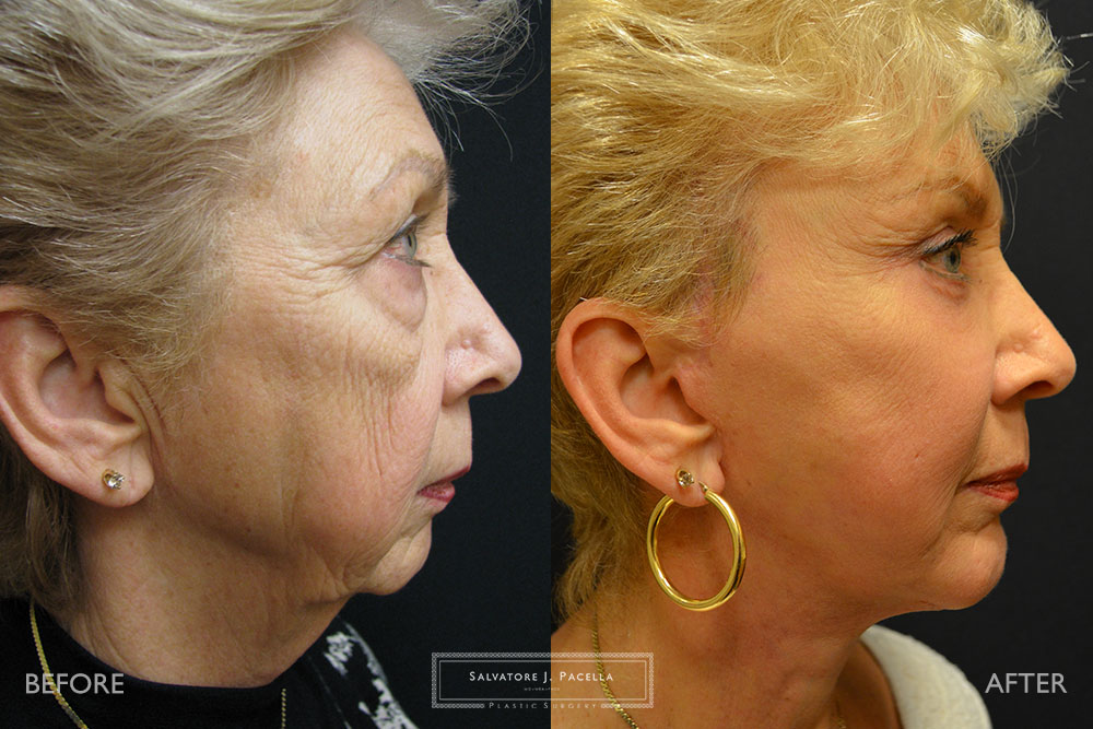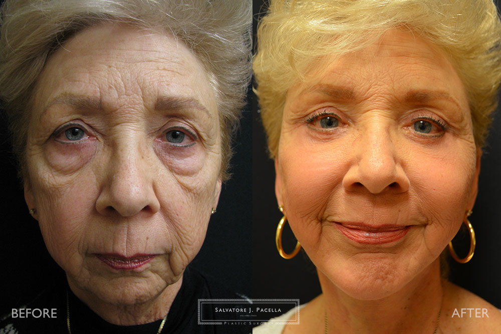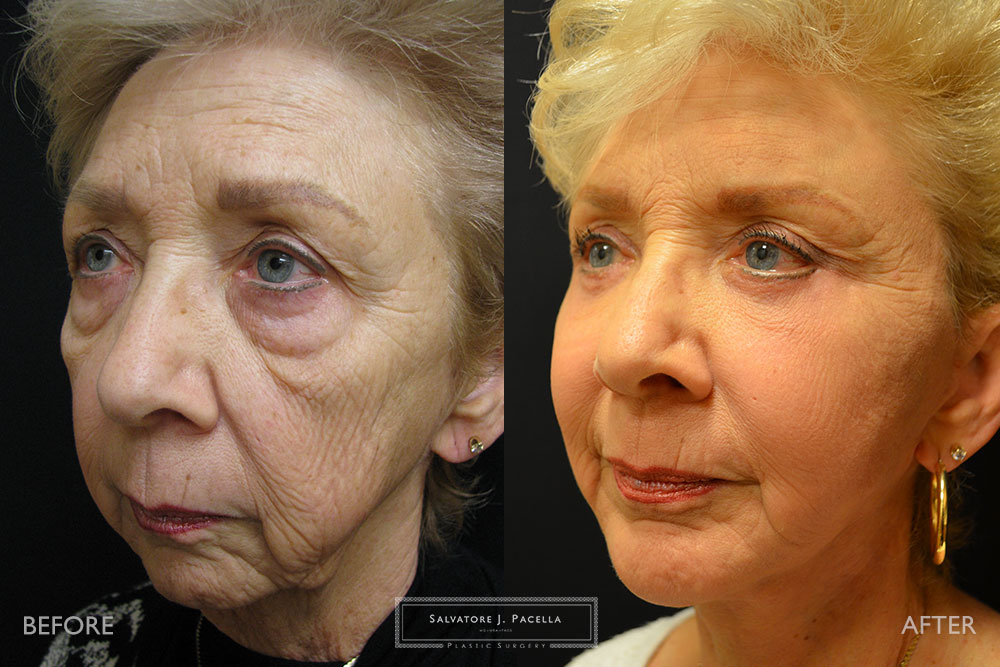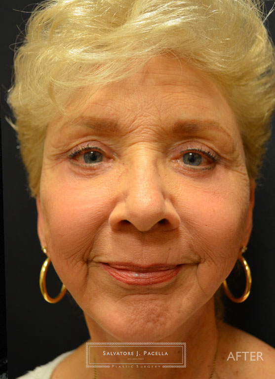 This 72 year-old woman was very unhappy with the appearance of her eyes, face and neck. Although she is very active and energetic, she felt that some pronounced eye bags and skin laxity made her look tired. In addition, she felt that her chin was receded and her neck had very loose skin. A complete, facial rejuvenation was planned. During one single operative session, she underwent an endoscopic browlift, upper and lower blepharoplasty and full deep plane face, cheek and necklift. In addition, a chin augmentation with a silicone implant was performed in order to improve facial balance and proportion. In order to restore the natural youthful curvature of the cheek, fat transfer from the abdomen was precisely positioned throughout the eyes, cheeks, and facial folds. Her result is pictured at 1 year, showing excellent longevity of the fat transfer and surgical techniques.