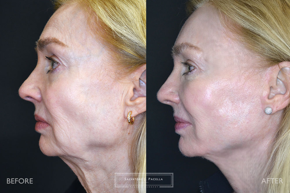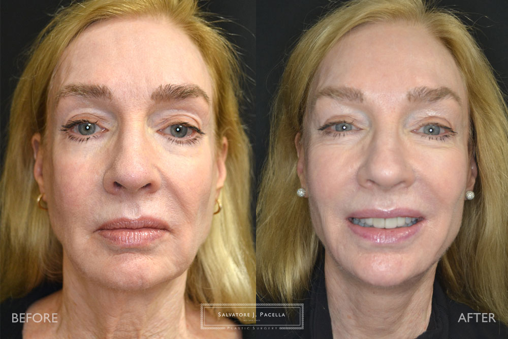 This elegant 71-year-old woman came to Dr. Salvatore Pacella seeking a comprehensive facial rejuvenation. She felt that her appearance no longer reflected the vitality she felt inside. Her main concerns included sagging in the cheeks and jawline, deep nasolabial folds, and loose skin in the neck.