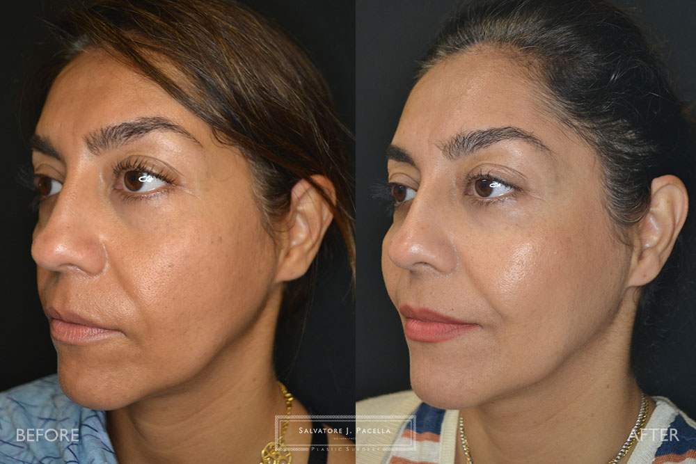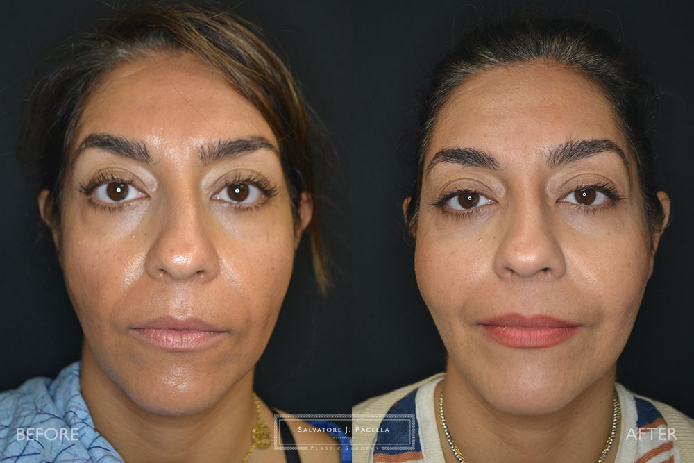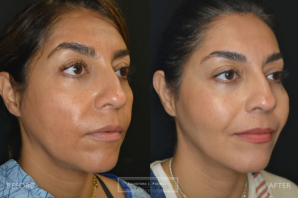 This 42-year-old female was unhappy with the appearance of her face and cheeks after significant weight loss. As we age, our faces tend to lose natural-appearing fat which is often found in the youthful face. Restoration of this fat volume was performed with precise fat transfer to the cheeks, jowls and facial folds…resulting in a beautiful and full cheek mass. total of 46 cc (23 each side in strategic deep plane areas). Her results at 1 year show excellent longevity of fat staying in the face.