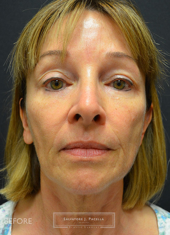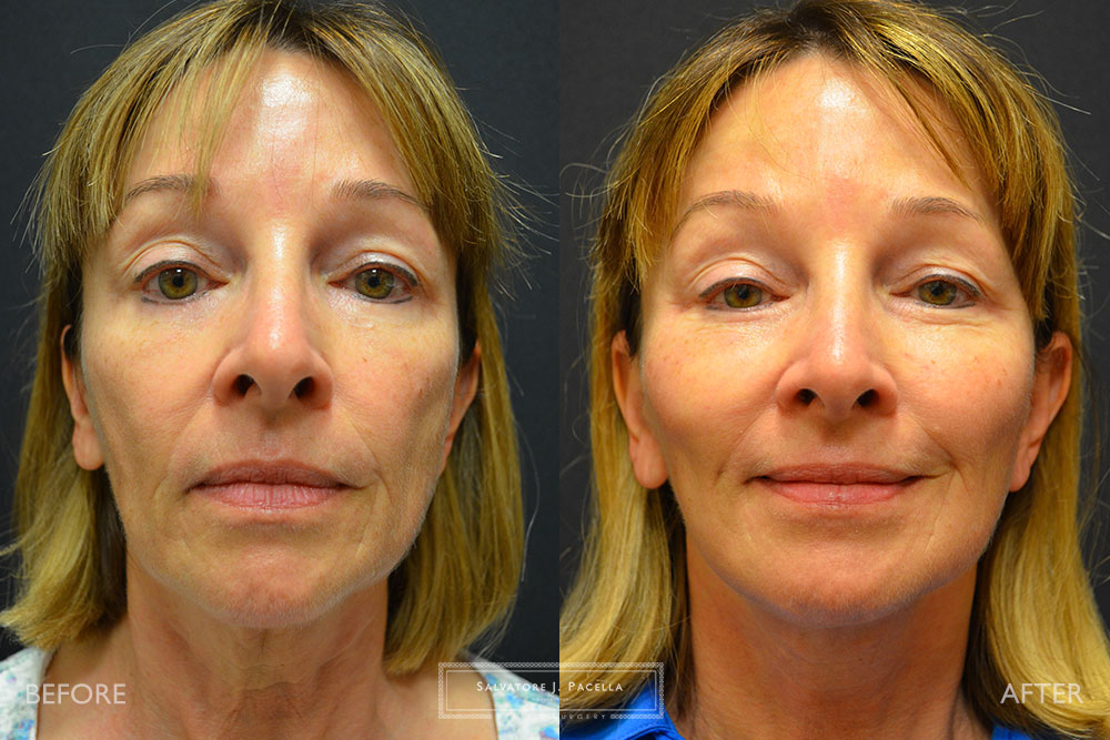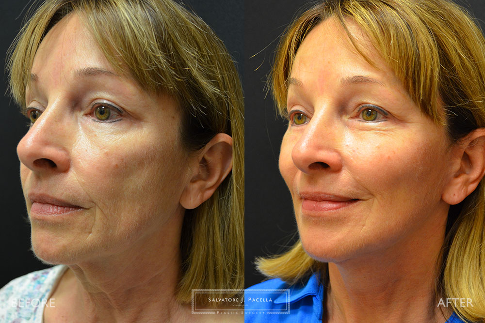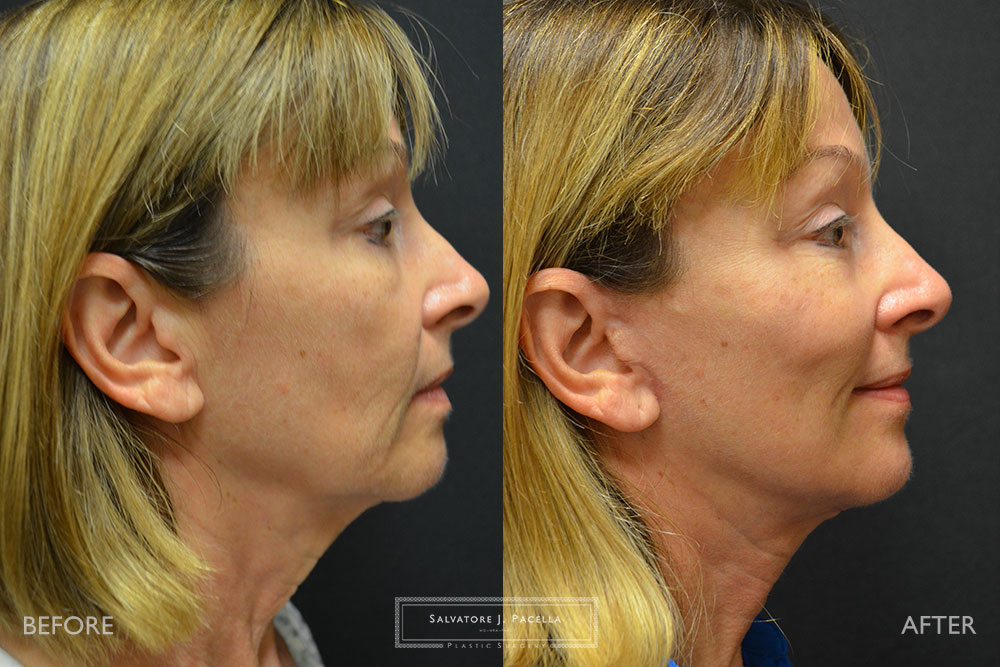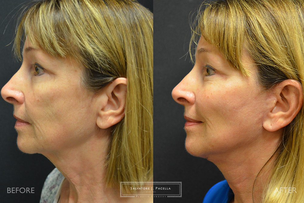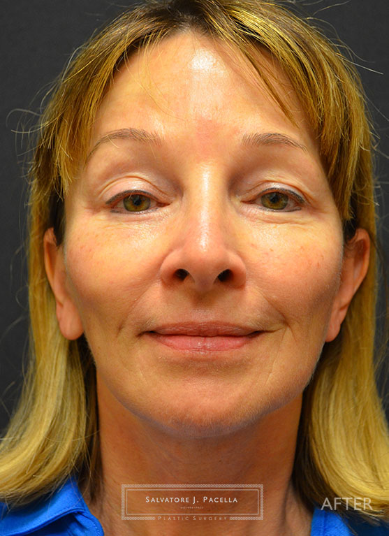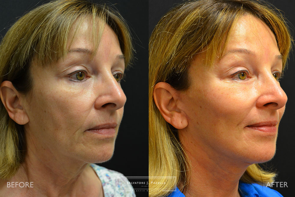 This 63 year-old woman desired facial rejuvenation. Specifically, she felt as if her face appeared “deflated” and loose, creating jowls and neck laxity. Fat transfer was performed to restore the youthful volume of the cheeks. A full facelift and necklift were also performed to resuspend the facial tissues to their youthful position. Postoperative results at 1 year show a very aesthetic and natural result without giving the appearance being “pulled too-tight.”